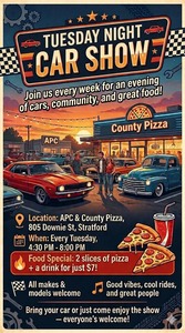 Join us every week for an evening of cars, community, and great food! There is a food special available: 2 slices of pizza plus a drink for just $7. All makes and models are welcome. Enjoy good vibes, cool rides, and great people. Bring your car or just come enjoy the show – everyone is welcome!