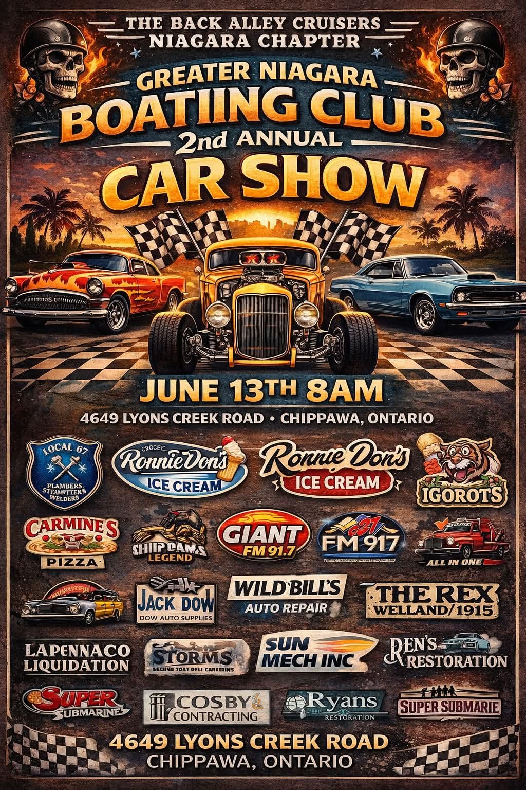 Join us for the 2nd Annual Car Show hosted by the Greater Niagara Boating Club. Attendees can enjoy delicious food from Carmine's Pizza and Super Submarine, and cool treats from Ronnie Don's Ice Cream. This family-friendly event promises a great time for all.