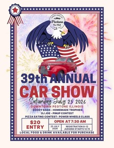 The 39th Annual Car Show features goody bags, homemade trophies, DJ Joe, a pinup contest, a pizza eating contest, and a Power Wheels class. Local food and drink will be available for purchase.