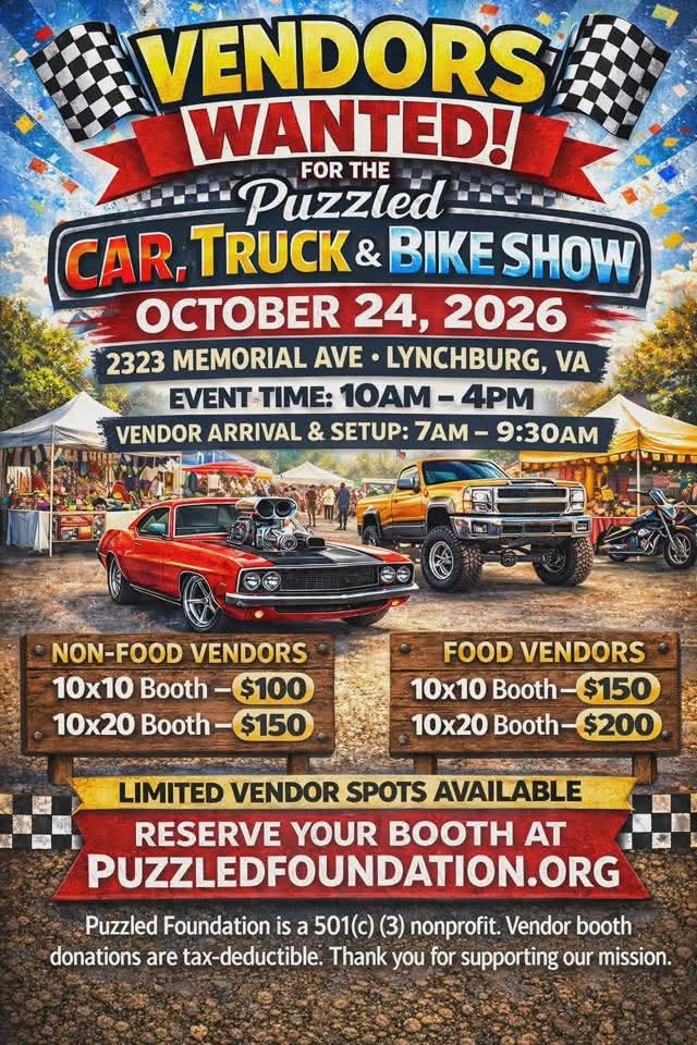 Vendors are wanted for The Puzzled Car, Truck & Bike Show. Limited vendor spots are available. Vendor booth pricing is as follows: Non-food vendors can reserve a 10x10 booth for $100 or a 10x20 booth for $150. Food vendors can reserve a 10x10 booth for $150 or a 10x20 booth for $200. The Puzzled Foundation is a 501(c)(3) nonprofit, and vendor booth donations are tax-deductible, supporting their mission.