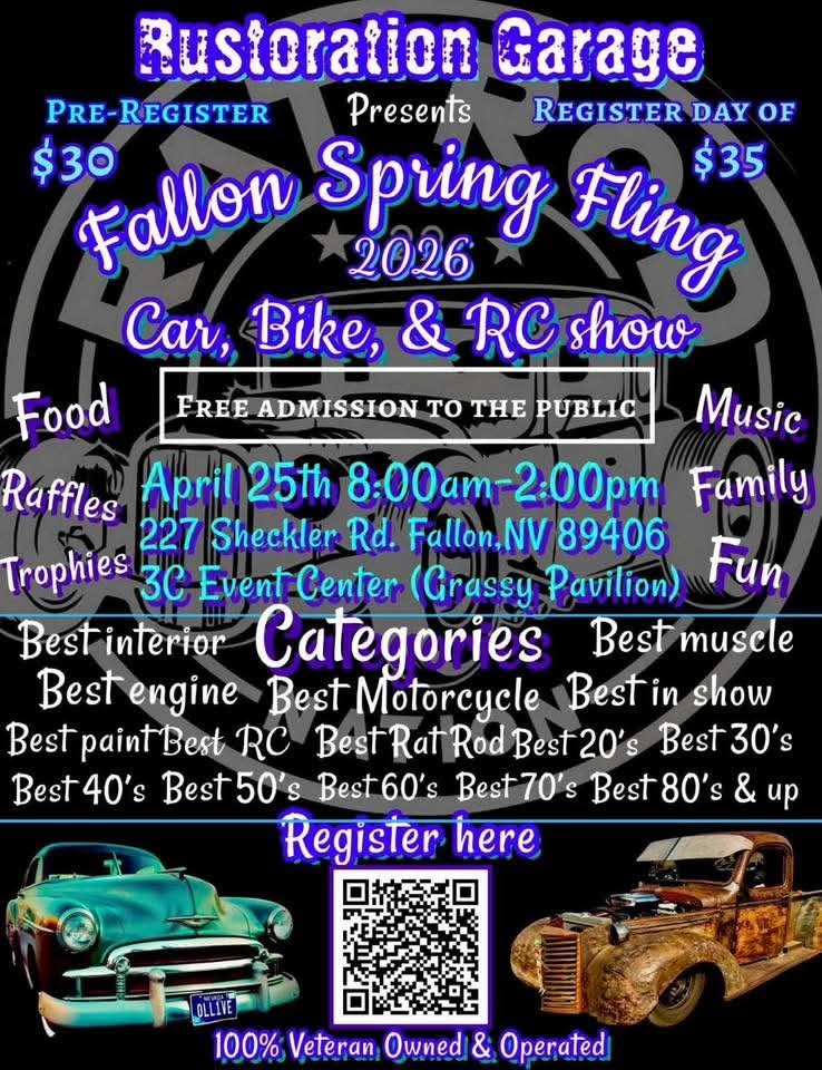 The Fallon Spring Fling 2026 is a Car, Bike, & RC show presented by Restoration Garage. Attendees can enjoy food, music, raffles, and family fun. Trophies will be awarded in various categories including Best Interior, Best Engine, Best Paint, Best Muscle, Best Motorcycle, Best RC, Best Rat Rod, Best in Show, Best 20's, Best 30's, Best 40's, Best 50's, Best 60's, Best 70's, Best 80's & up.