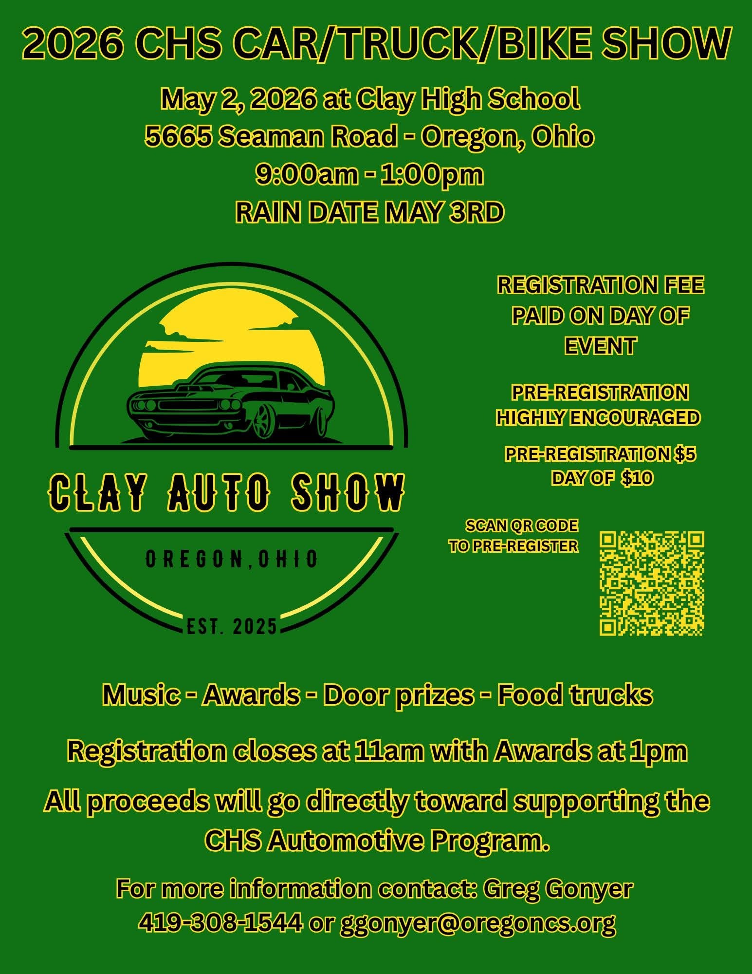 The event will feature music, awards, door prizes, and food trucks. Vehicle registration closes at 11:00 AM, with award presentations scheduled for 1:00 PM.