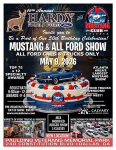 Be a part of the 50th Birthday Celebration! This is the 14th Annual Mustang & All Ford Show, presented by Hardy Family Ford and the Georgia Regional Mustang Club Atlanta. It features all Ford cars and trucks only, including an MCA Modified Judged Show with 5 classes. Attendees can expect top 75 awards and 12 specialty awards. It is known as the Atlanta area's largest Mustang show, with more room available for Ford vehicles. The event will have lots of food trucks and vendors, and will include a swap meet.