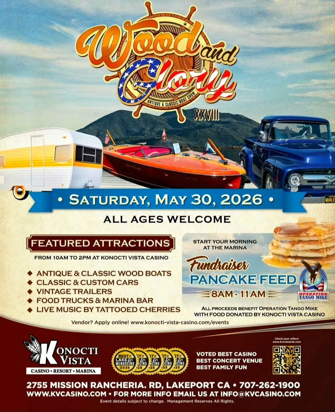 The event features antique and classic wood boats, classic and custom cars, and vintage trailers. Guests can enjoy food trucks, a marina bar, and live music by Tattooed Cherries. A fundraiser pancake feed will be held from 8 AM to 11 AM at the marina.