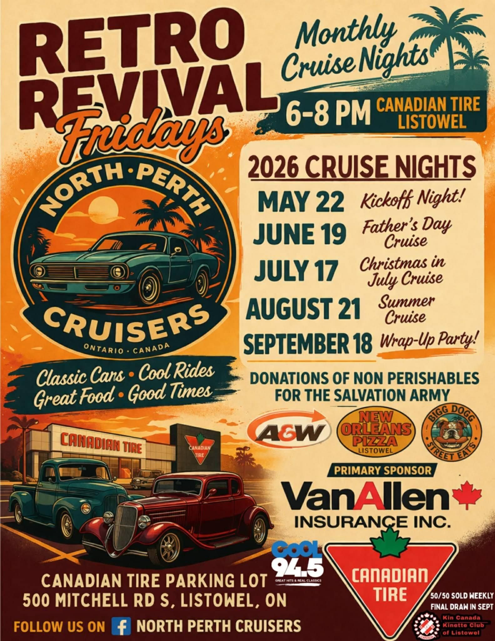 Join the North Perth Cruisers for their Retro Revival Fridays Monthly Cruise Nights, featuring classic cars, cool rides, great food, and good times. The event takes place monthly from May to September. A 50/50 draw is sold weekly with a final draw in September. Please bring donations of non-perishable food items.