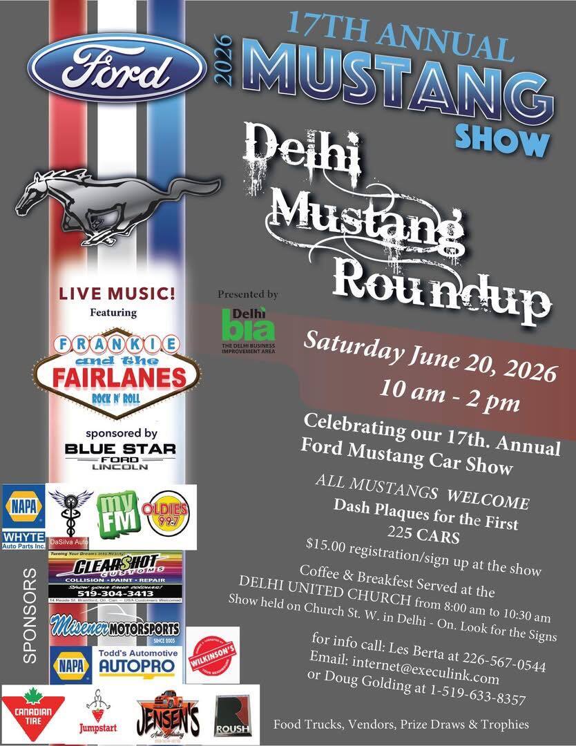 This event features live music from Frankie and the Fairlanes Rock N' Roll. Dash plaques will be provided for the first 225 cars. Coffee and breakfast will be served at the Delhi United Church from 8:00 AM to 10:30 AM. Food trucks, vendors, prize draws, and trophies will also be available.