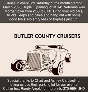 Bring your old cars, trucks, jeeps, and bikes and hang out with some good folks! There are no entry fees or trophies, just fun! Event Sponsors: Chad and Ashley Cardwell