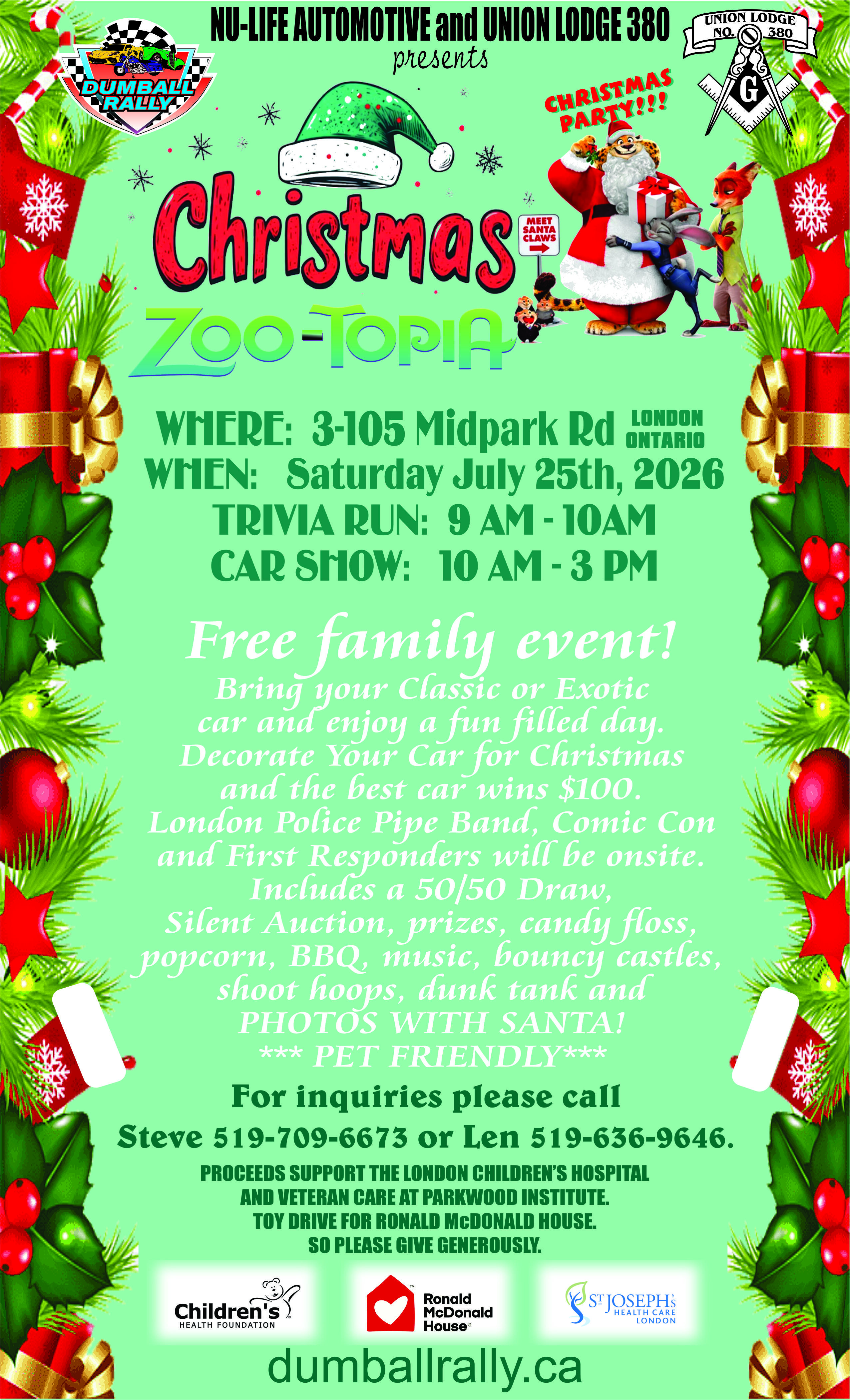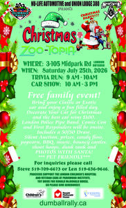 Bring your Classic or Exotic car and enjoy a fun filled day. Decorate your car for Christmas and the best car wins $100. London Police Pipe Band, Comic Con, and First Responders will be onsite. The event includes a 50/50 Draw, Silent Auction, prizes, candy floss, popcorn, BBQ, music, bouncy castles, shoot hoops, dunk tank and photos with Santa! The event is pet friendly.