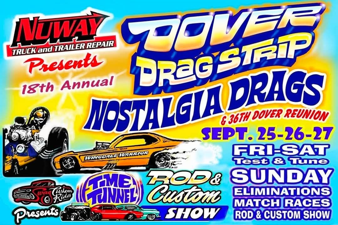 This event features the 18th Annual Dover Drag Strip Nostalgia Drags and the 36th Dover Reunion. Friday and Saturday will include test and tune sessions. Sunday will feature eliminations, match races, and a Rod & Custom Show.