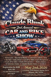 The 2nd Annual Claude Blunk Car and Bike Show features various classes for vehicles, including Motorcycle, Ran Out of Money, Lowered, Lifted, Jeep, Rat Rod, Daily Driver, Car (69 or older), Car (70 to present), Truck (69 or older), Truck (70 to present), Kid's choice, Veterans Choice, and Claude Blunk Choice. Registration for vehicles starts at 8:00 AM and ends at 11:00 AM. Judging takes place from 11:30 AM to 1:00 PM. Trophies will be awarded to 1st and 2nd place in each class, plus a 'Top 5', with the trophy handout scheduled for 2:30 PM. The vehicle registration fee is $20, with a special $5 fee for kids entering their vehicles in the show.