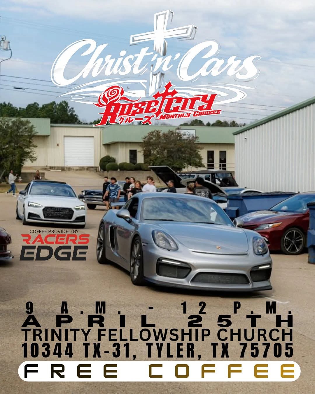 Attendees can enjoy free coffee provided by Racers Edge at this Christ n' Cars monthly cruise event.