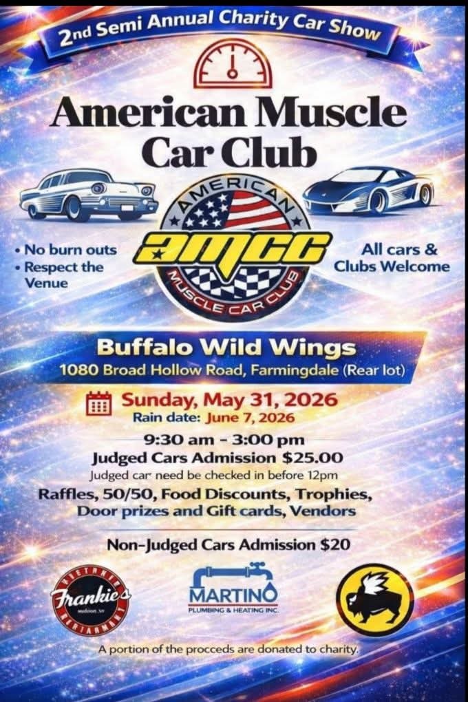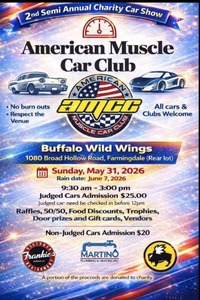 This is the 2nd Semi Annual Charity Car Show hosted by the American Muscle Car Club. All cars and clubs are welcome. Please no burnouts and respect the venue. The event will feature raffles, a 50/50 draw, food discounts, trophies, door prizes, and gift cards. Vendors will also be present. Judged cars need to be checked in before 12 PM. Non-judged cars admission is $20.00. The event has a rain date scheduled for June 7, 2026. A portion of the proceeds will be donated to charity.