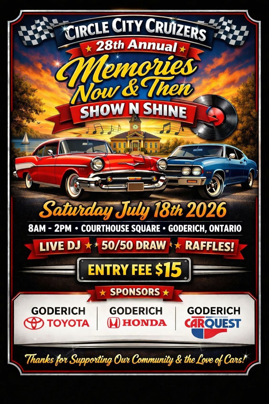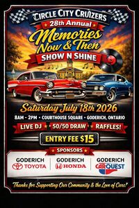 Join the Circle City Cruizers for their 28th Annual Memories Now & Then Show N Shine event. The event will feature a live DJ, a 50/50 draw, and raffles. This event celebrates the community and the love of cars.