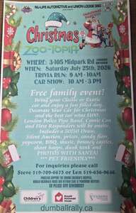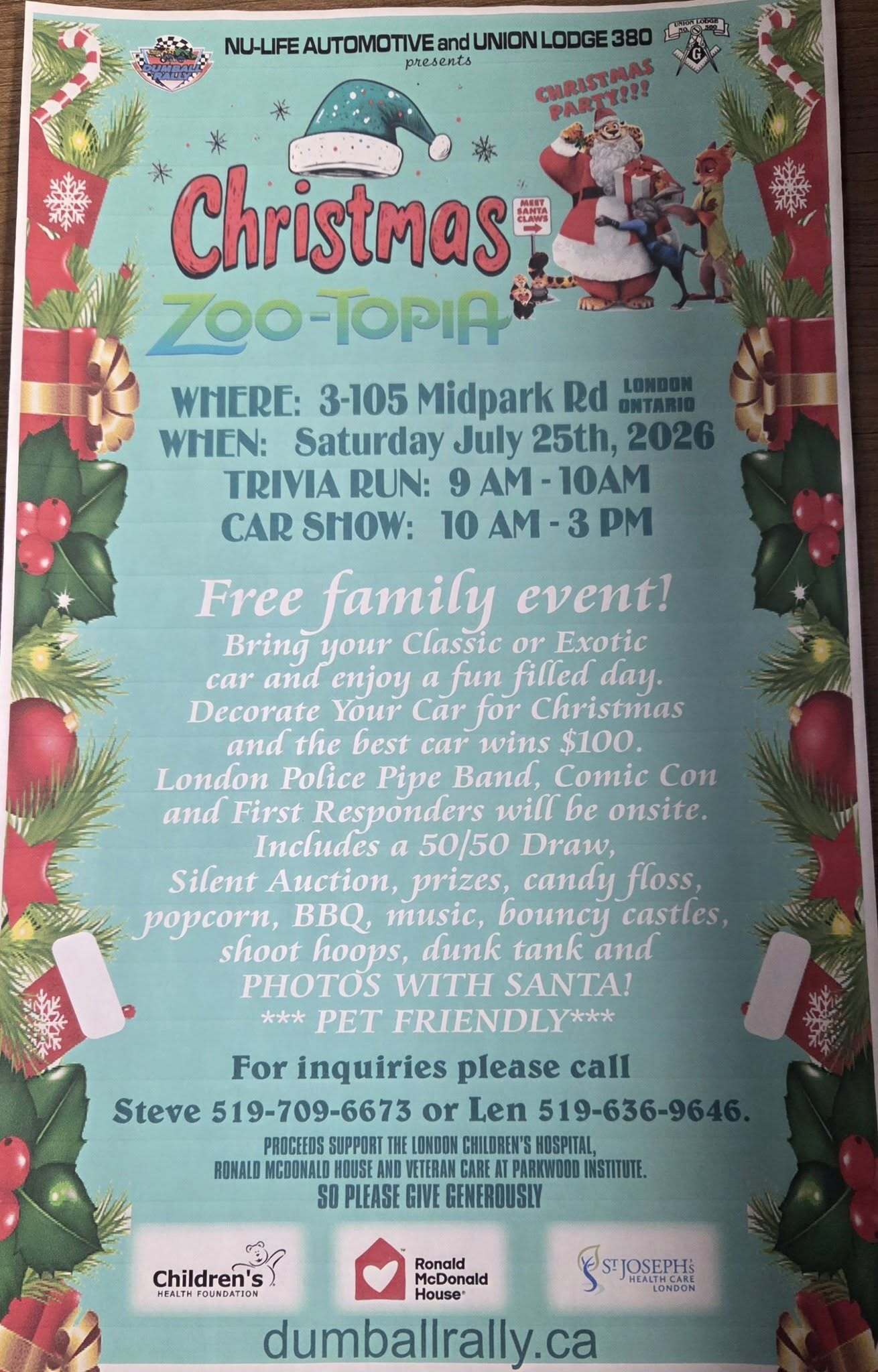 This is a free family event. Attendees are encouraged to bring their classic or exotic cars to enjoy a fun-filled day. Participants can decorate their cars for Christmas, with the best decorated car winning $100. The event will feature the London Police Pipe Band, Comic Con representatives, and First Responders onsite. Activities include a 50/50 draw, a silent auction, prizes, candy floss, popcorn, BBQ, music, bouncy castles, shoot hoops, a dunk tank, and photos with Santa. The event is pet-friendly.
