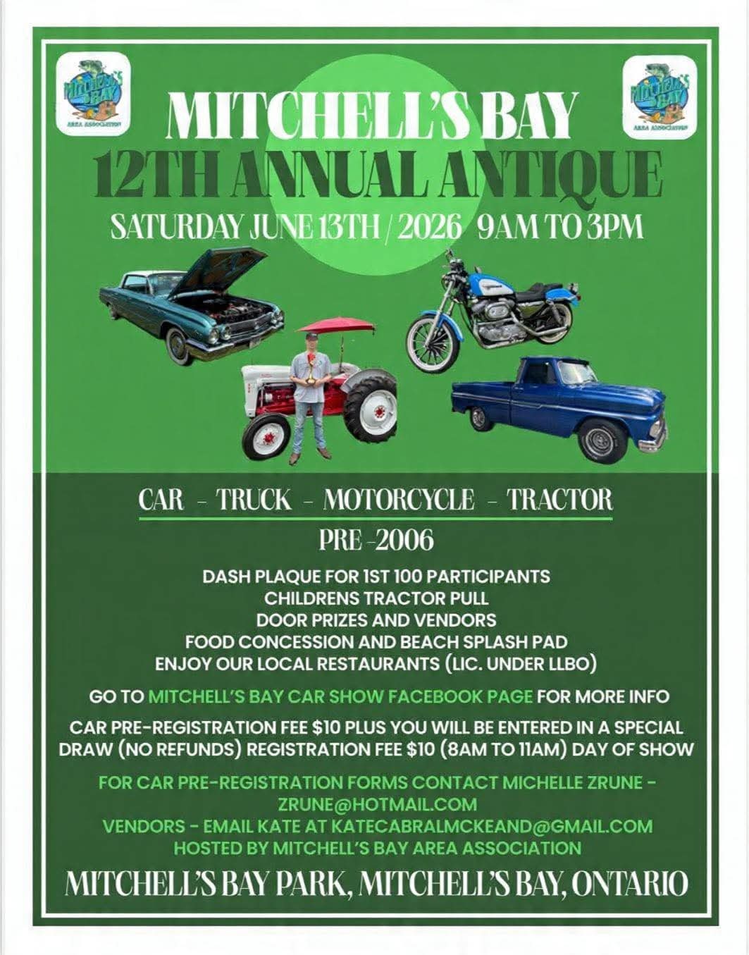A dash plaque will be given to the first 100 participants. The event will feature a children's tractor pull, door prizes, and various vendors. Attendees can enjoy a food concession and a beach splash pad. Guests are encouraged to enjoy the local restaurants, which are licensed under LLBO.