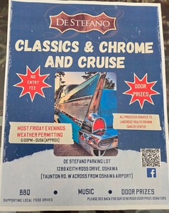Join the Classics & Chrome and Cruise event, held most Friday evenings, weather permitting. The event features a BBQ supporting local food drives, music, and door prizes. All proceeds from the event will be donated to the Lakeridge Health Oshawa Cancer Center. Please see the back of the flyer for a list of generous door prize donators.