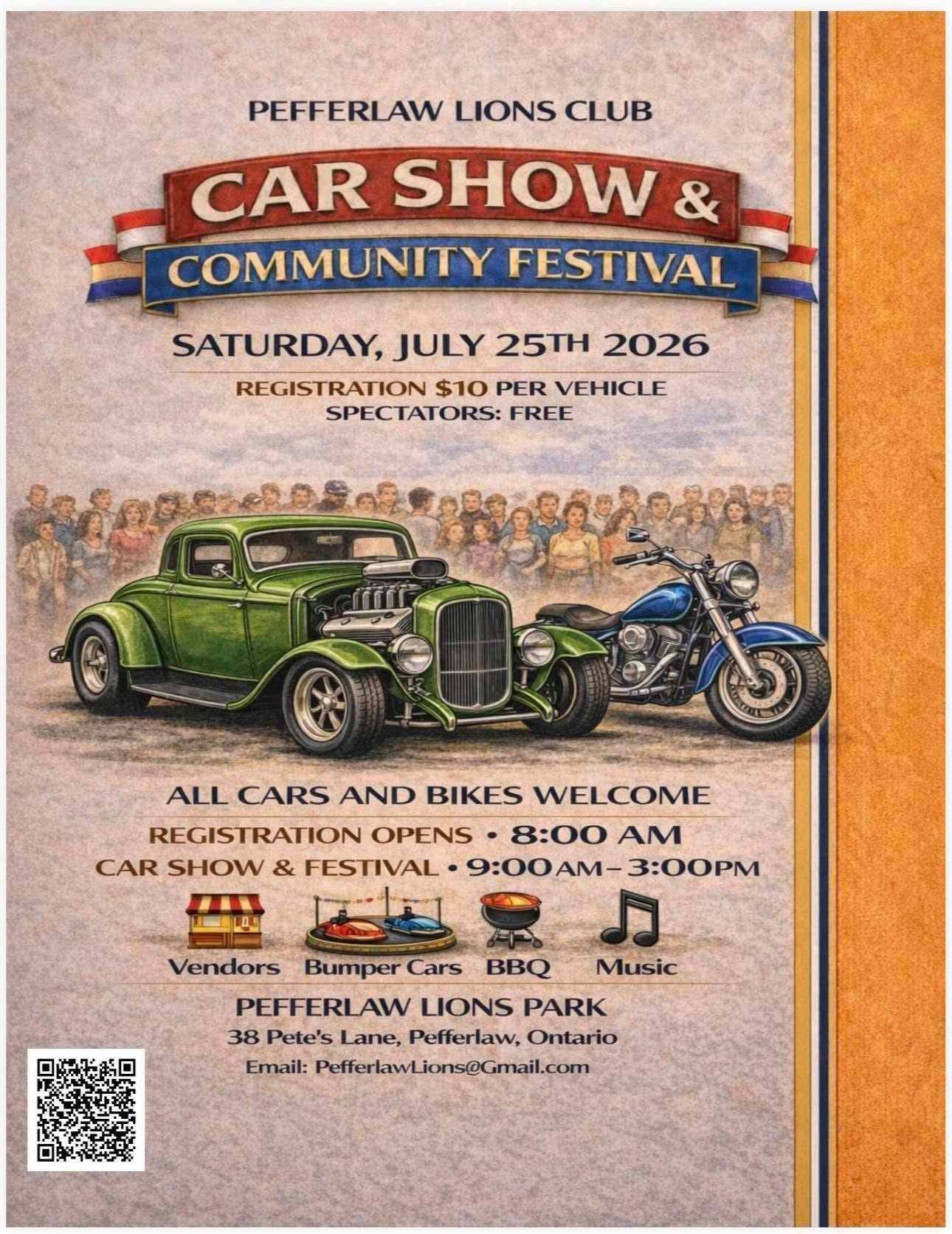 The Pefferlaw Lions Club is hosting a Car Show & Community Festival. This event will feature cars, bikes, BBQ, bumper cars, and family fun. Vendor spaces are available for food trucks for $125.00, 10-foot booths for $30.00, and community groups can register for free. Spaces are limited, and registration is encouraged via email.