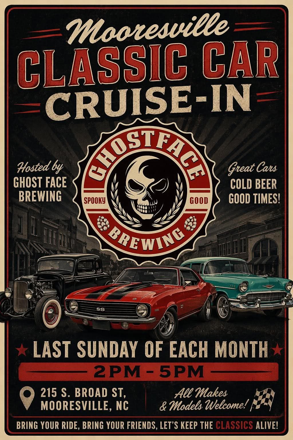 Join us for great cars, cold beer, and good times! All makes and models are welcome. Bring your ride, bring your friends, let's keep the classics alive! Hosted by Ghost Face Brewing.