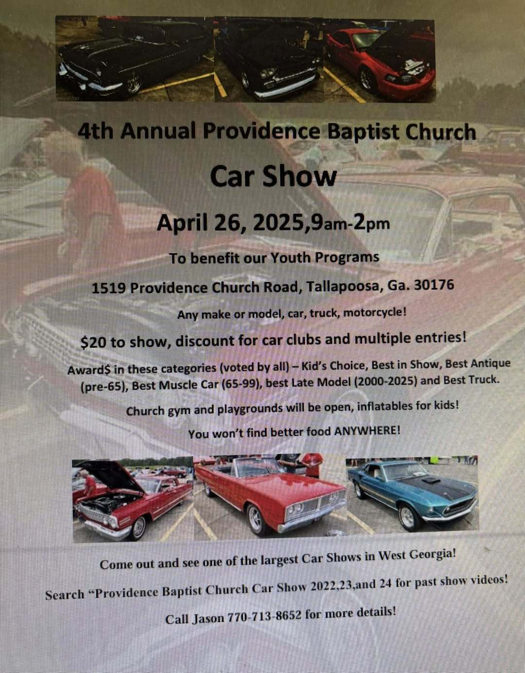 Come out and see one of the largest car shows in West Georgia. Awards will be given in these categories, voted by all, Kids Choice, Best in Show, Best Antique (pre-65), Best Muscle Car (65-99), Best Late Model (2000-2025), and Best Truck. Church gym and playgrounds will be open, inflatables for kids and food will be available to purchase.