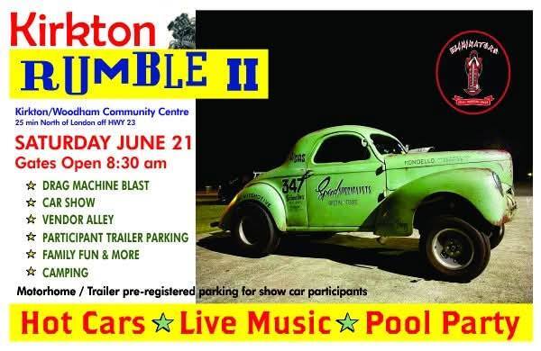Event includes drag machine blast, car show, vendor alley, participant trailer parking, family fun, camping, hot cars, live music, and pool party. Motorhome/Trailer pre-registered parking for show car participants.