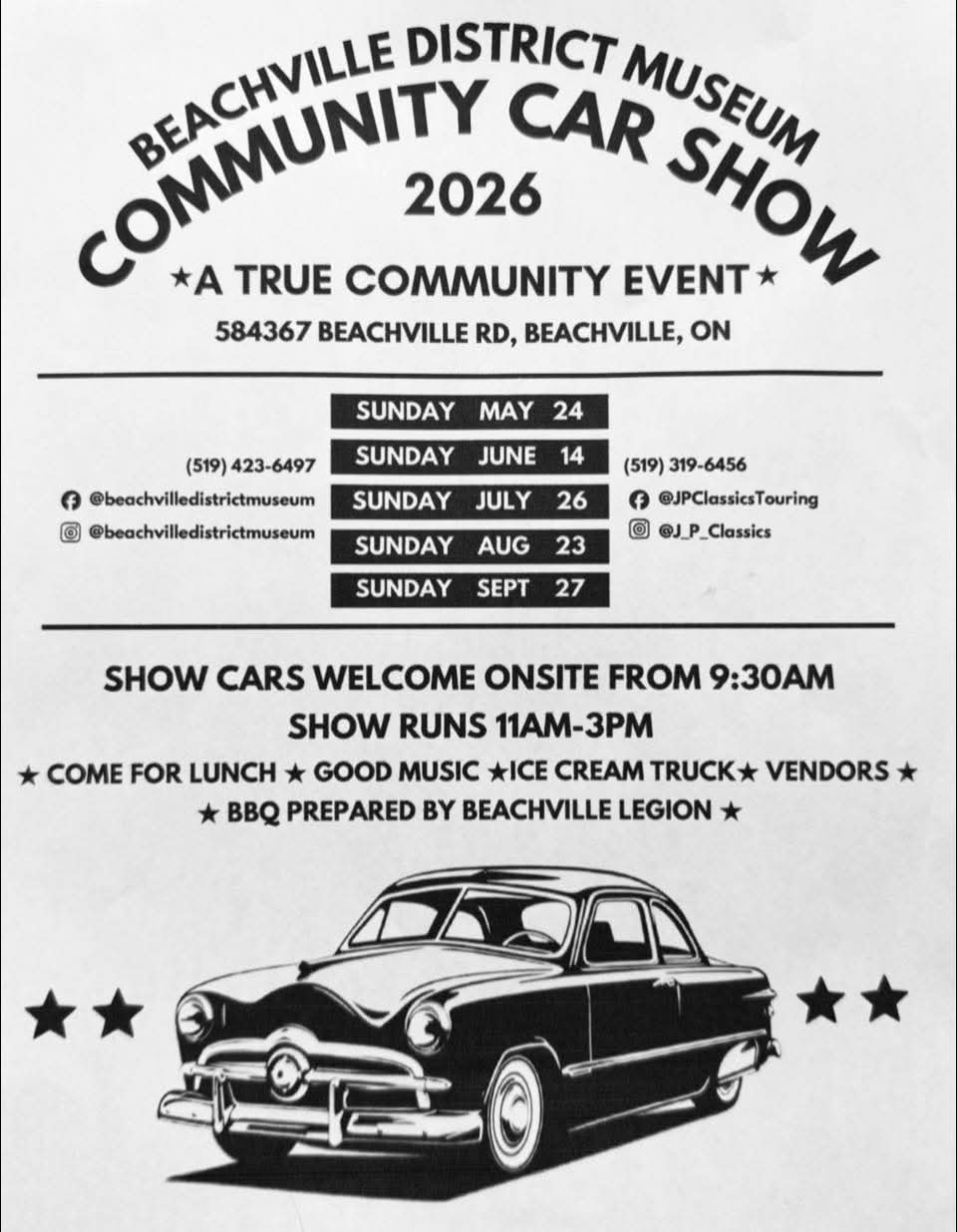 Show cars are welcome onsite from 9:30 AM. The show runs from 11 AM to 3 PM. Attendees can come for lunch, enjoy good music, and find an ice cream truck and vendors. BBQ will be prepared by Beachville Legion.