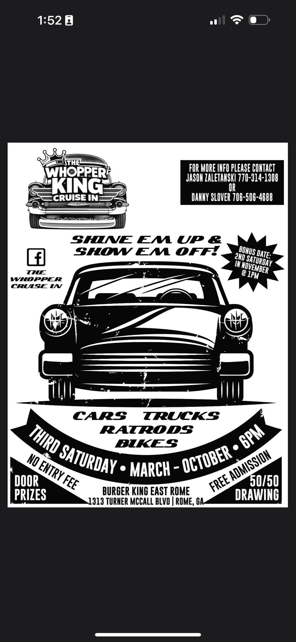 Shine 'em up and show 'em off at The Whopper King Cruise In! This monthly event features door prizes and a 50/50 drawing. Cars, trucks, ratrods, and bikes are welcome. There is free admission and no entry fee for vehicles. A bonus date is scheduled for the second Saturday in November at 1 PM.