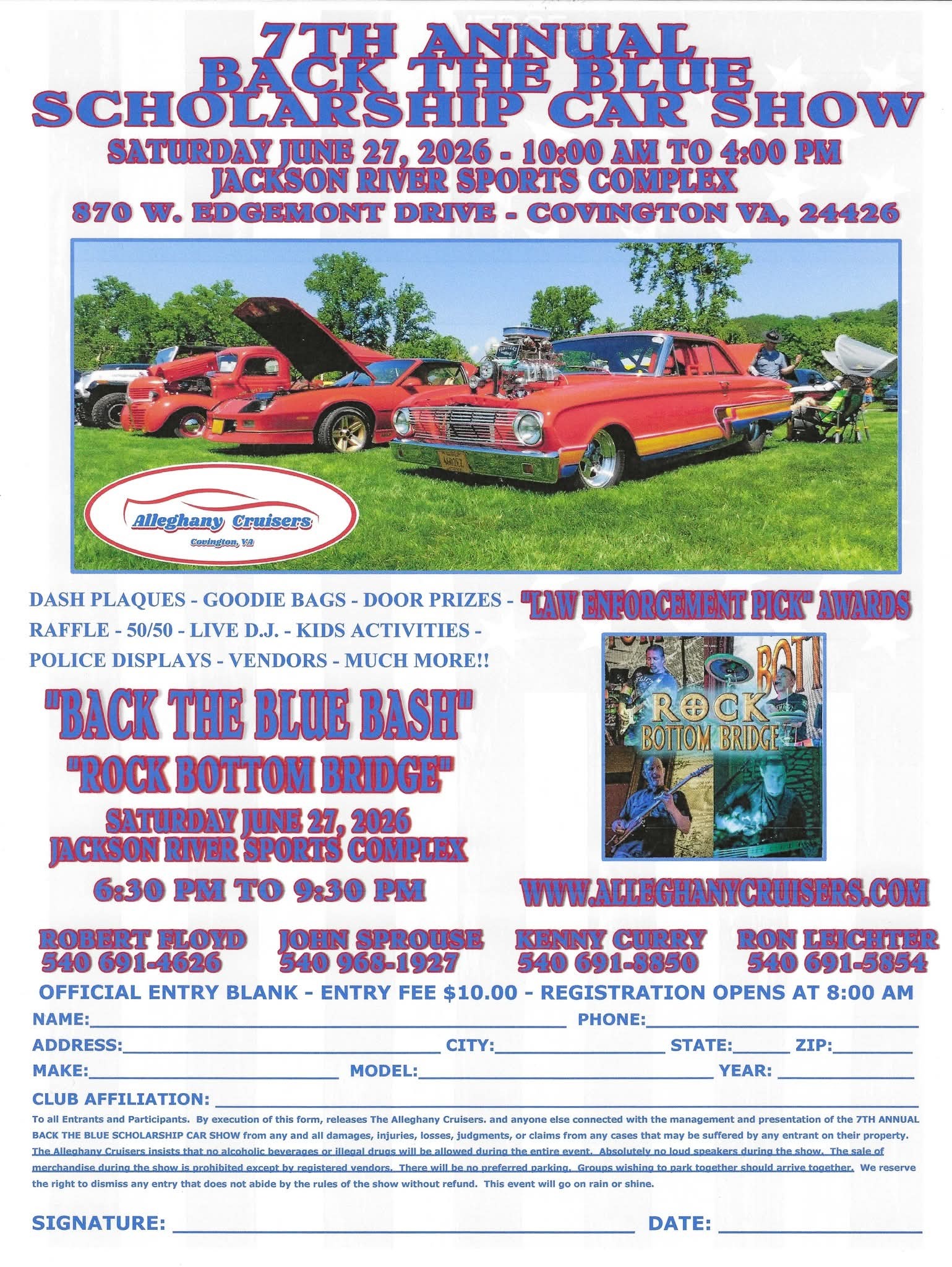 The 7th Annual Back the Blue Scholarship Car Show promises a fun-filled day with dash plaques, goodie bags, door prizes, and "Law Enforcement Pick" awards. Guests can participate in a raffle and 50/50 draw, enjoy a live DJ, and find activities for kids. The event will also feature police displays and vendors. As part of the festivities, there will be a "Back the Blue Bash" with music from "Rock Bottom Bridge" from 6:30 PM to 9:30 PM. This event will go on rain or shine.
