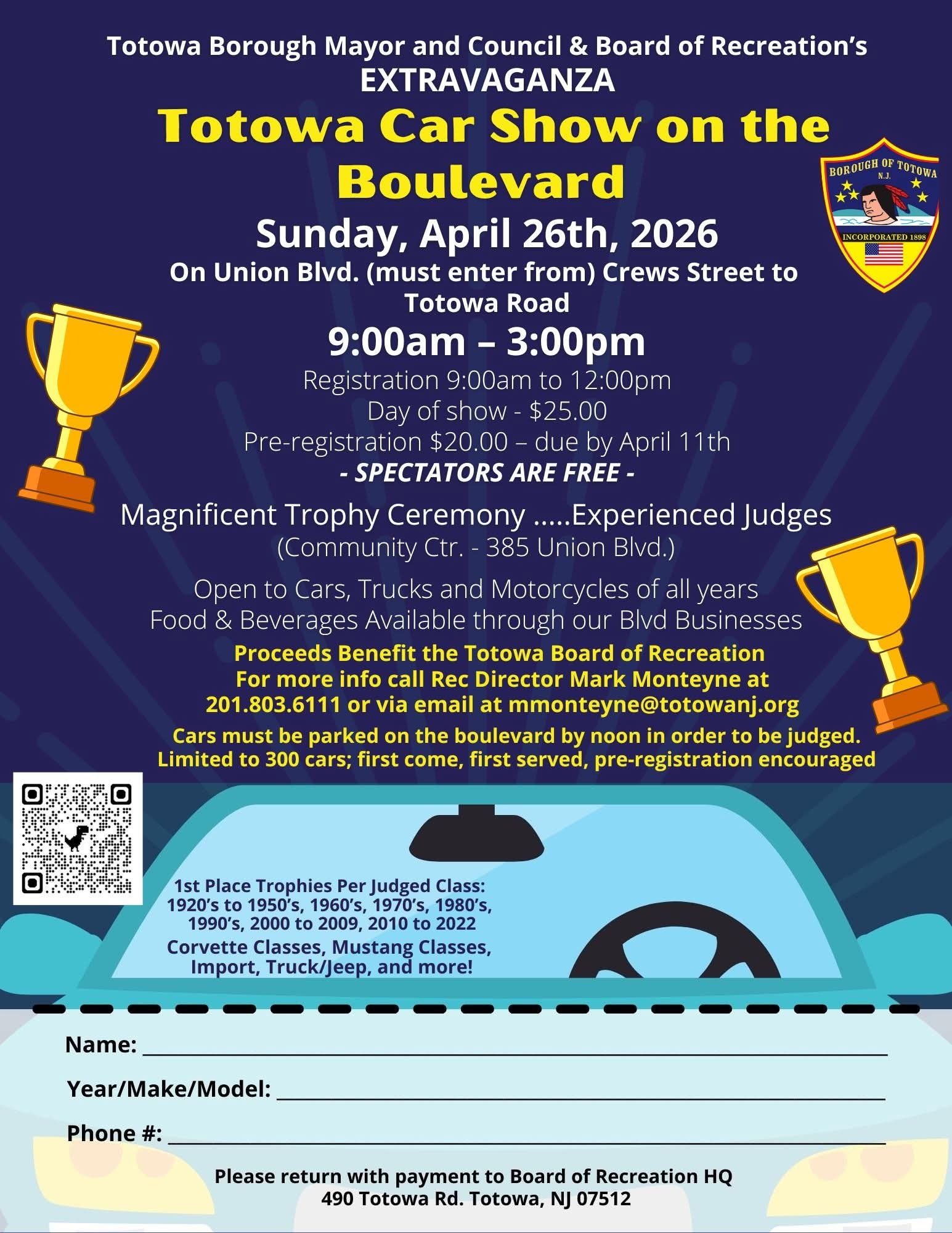 Join the Totowa Car Show on the Boulevard for a day of magnificent vehicles. The event is open to cars, trucks, and motorcycles of all years. Participants can enjoy food and beverages available through Boulevard businesses. There will be a magnificent trophy ceremony with experienced judges. Trophies will be awarded for 1st place per judged class, including vehicles from the 1920s to 1950s, 1960s, 1970s, 1980s, 1990s, 2000 to 2009, 2010 to 2022, as well as specific Corvette classes, Mustang classes, Import, Truck/Jeep, and more. The event is limited to 300 cars; entry is first come, first served, and pre-registration is encouraged. Cars must be parked on the boulevard by noon in order to be judged.