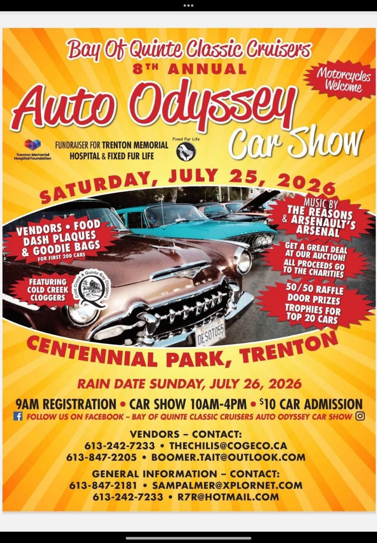 This is the 8th Annual Auto Odyssey Car Show, featuring music by The Reasons & Arsenault's Arsenal and performances by the Cold Creek Cloggers. Attendees can enjoy food, an auction, a 50/50 raffle, and door prizes. Dash plaques and goodie bags will be given to the first 200 cars, and trophies will be awarded to the top 20 cars. All proceeds from the auction go to the supporting charities.