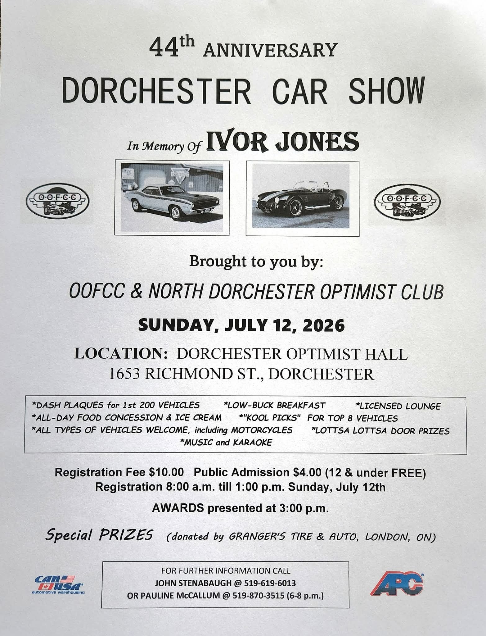 Event Sponsors: OOFCC, North Dorchester Optimist Club, Granger's Tire & Auto, Can-Am USA, APC.