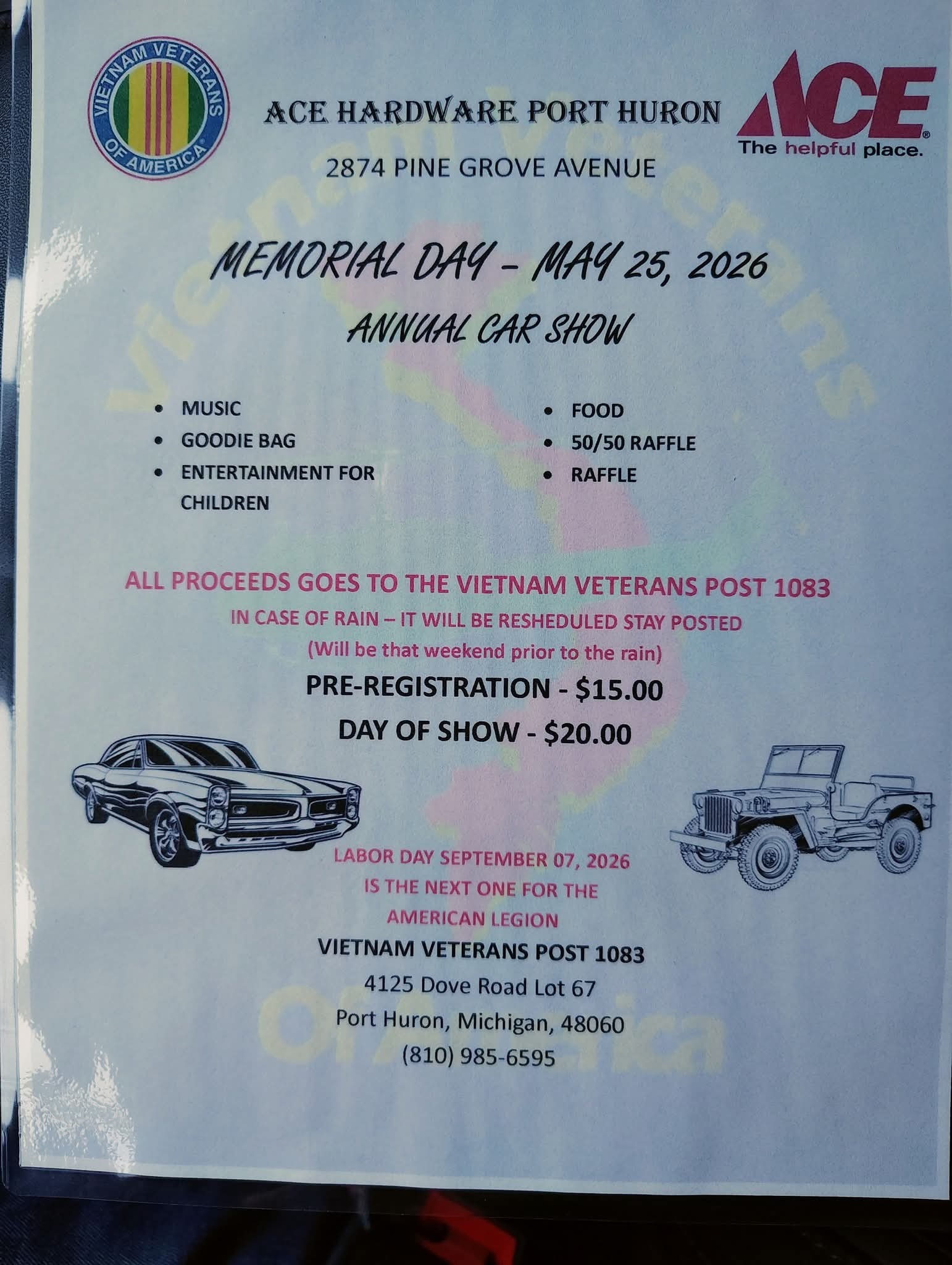 This annual car show, hosted by Ace Hardware Port Huron, features music, goodie bags, entertainment for children, food, a 50/50 raffle, and an additional raffle. In case of rain, the event will be rescheduled for that weekend prior to the rain.