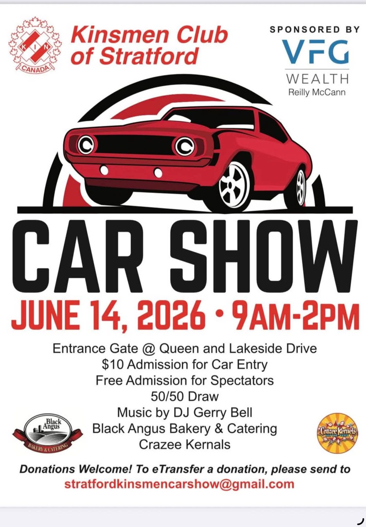 Join the Kinsmen Club of Stratford for a fun Car Show! Enjoy music by DJ Gerry Bell, a 50/50 Draw, and delicious food available from Black Angus Bakery & Catering and Crazee Kernals. Donations are welcome and can be sent via eTransfer.
