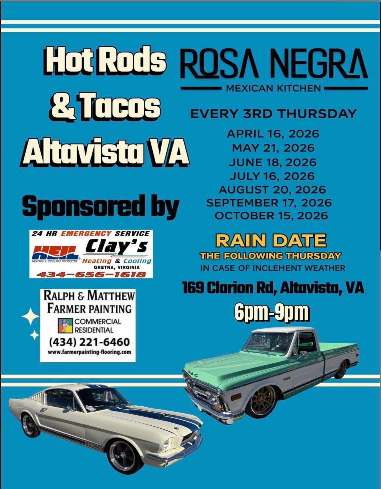 Hot Rods & Tacos is a recurring car cruise-in event held at Rosa Negra Mexican Kitchen in Altavista, VA. Attendees can enjoy a display of hot rods and classic cars, with tacos available from Rosa Negra Mexican Kitchen. The event takes place every third Thursday of the month from April through October. A rain date is scheduled for the following Thursday in case of inclement weather.