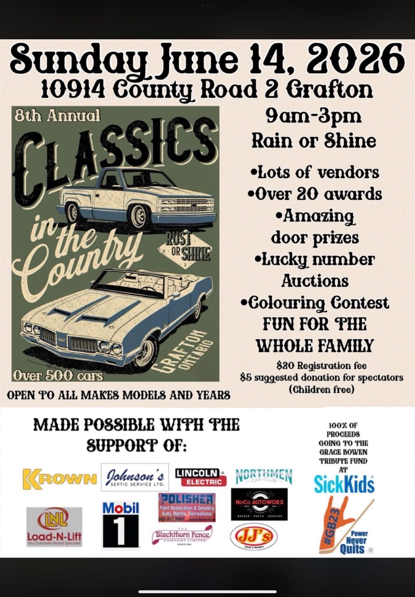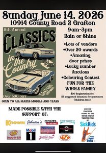 This is the 8th annual Classics in the Country event, taking place rain or shine. It features lots of vendors, over 20 awards, amazing door prizes, lucky number auctions, and a colouring contest, making it fun for the whole family. Over 500 cars are expected, open to all makes, models, and years.
