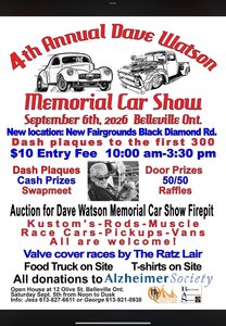The 4th Annual Dave Watson Memorial Car Show features dash plaques for the first 300 vehicles, cash prizes, door prizes, a 50/50 draw, and raffles. A swapmeet will also be held. An auction for a Dave Watson Memorial Car Show Firepit is planned. Kustom's, Rods, Muscle cars, Race Cars, Pickups, and Vans are all welcome. There will be valve cover races hosted by The Ratz Lair. A food truck and T-shirts will be available on site.