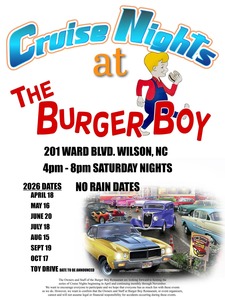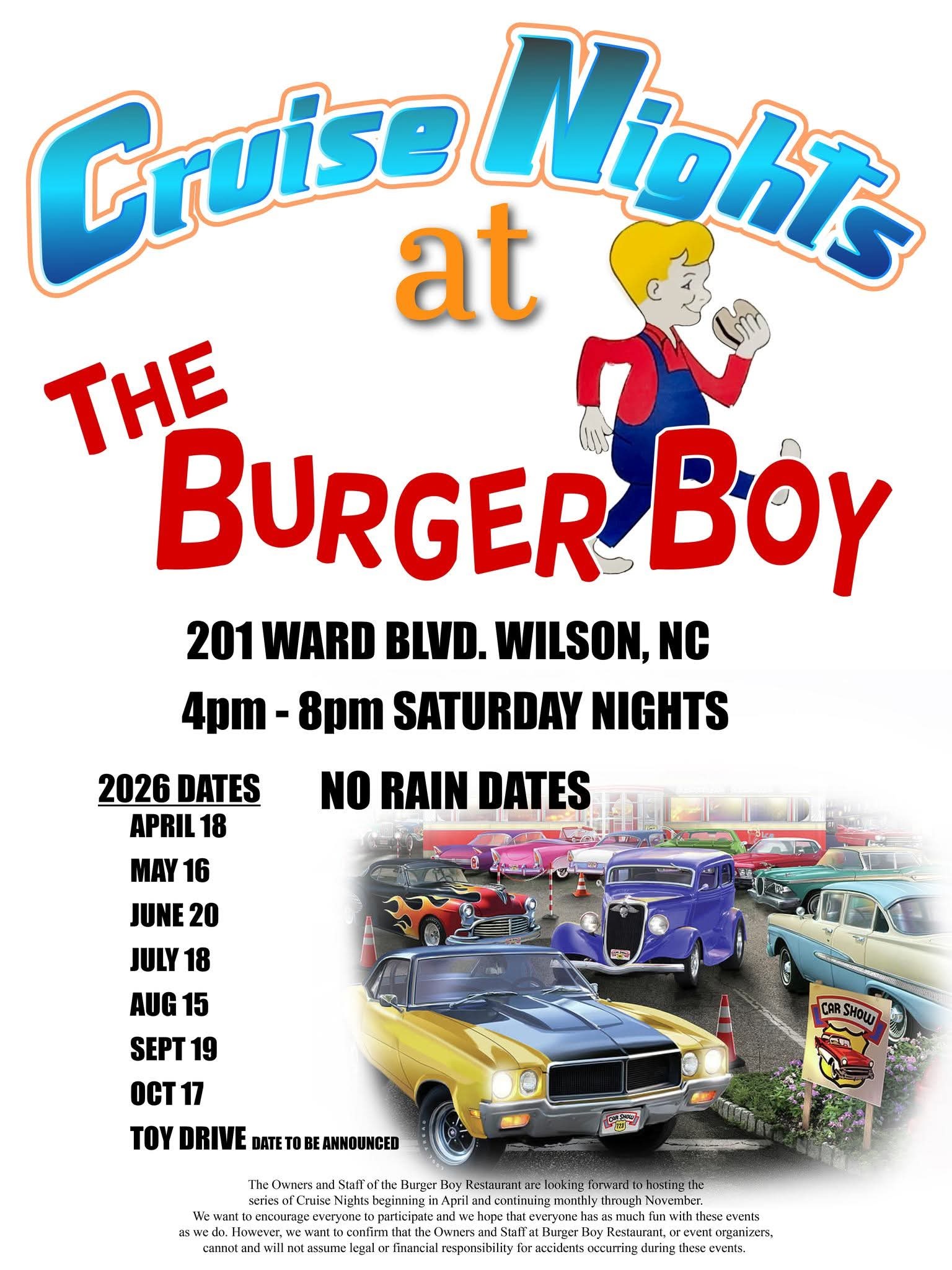 The owners and staff of the Burger Boy Restaurant are looking forward to hosting a series of Cruise Nights, beginning in April and continuing monthly through November. Everyone is encouraged to participate and have fun. Food will be available from Burger Boy Restaurant. A Toy Drive date is to be announced. Please note that the Owners and Staff at Burger Boy Restaurant, or event organizers, cannot and will not assume legal or financial responsibility for accidents occurring during these events.