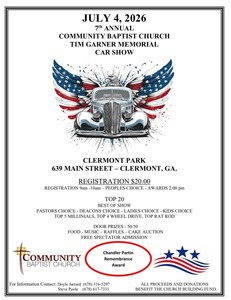 Join us for the 7th Annual Community Baptist Church Tim Garner Memorial Car Show. Awards include Top 20, Pastor's Choice, Deacon's Choice, Ladies Choice, Kids Choice, Top 5 Millennials, Top 4 Wheel Drive, Top Rat Rod, and the Chandler Partin Remembrance Award. Enjoy food, music, raffles, a cake auction, and door prizes including a 50/50 draw. Spectator admission is free.