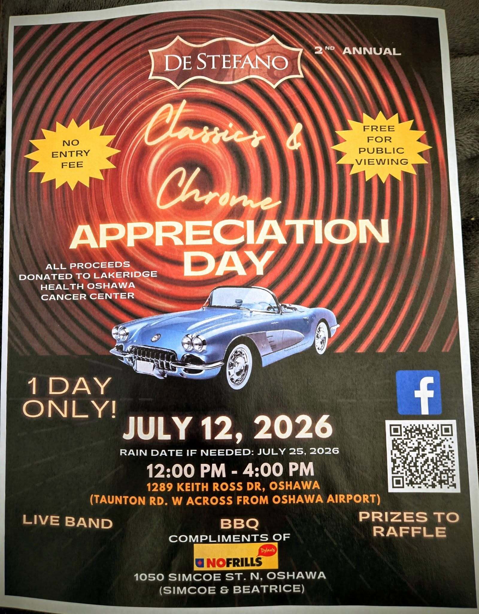 This is an appreciation day event featuring classic cars and chrome vehicles. Attendees can enjoy a live band and a complimentary BBQ. There will also be prizes to raffle. Vehicle entry is free, and public viewing is also free.