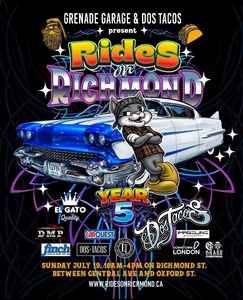 The 5th Annual Rides on Richmond is a car and truck show presented by Grenade Garage and Dos Tacos. This event showcases various vehicles on Richmond Street, between Central Avenue and Oxford Street, in Downtown London. No specific information regarding food, drinks, raffles, 50/50 draws, or plaques is available.
