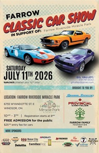 The Farrow Classic Car Show is being held in support of Farrow Riverside Miracle Park. Registration for cars begins at 8 AM. Public admission is free, while there is a $25.00 entry fee for cars.