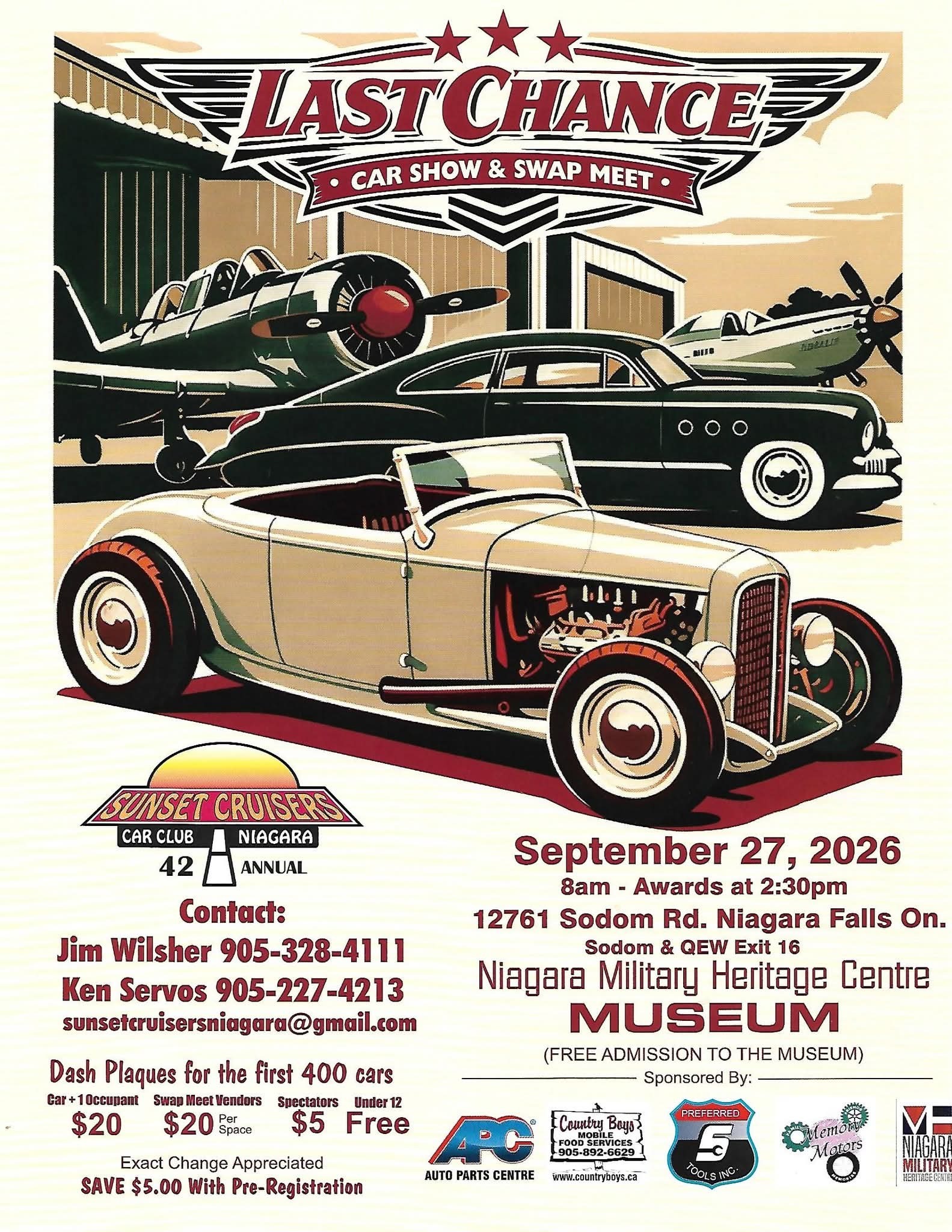 Event Sponsors: APC Auto Parts Centre, Country Boy's Mobile Food Services, Preferred 5 Tools Inc., Memory Motors, Niagara Military Heritage Centre Museum.